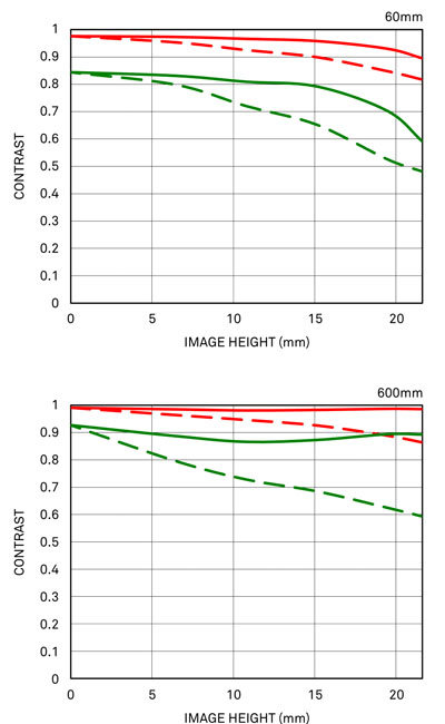 From the images, you can see that Sigma 60-600mm F4.5-6.3 DG DN lens is equipped with buttons, lock switches, custom switches, and a 6m focus limiter on the lens barrel. Comparing the optical performance of the 60-600mm F4.5-6.3 DG OS HSM for single-lens reflex cameras with the MTF chart, it seems that the peripheral area is particularly improved (the image above is the geometric optical MTF).