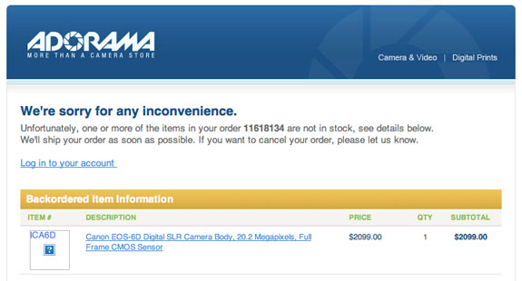 Today, one of top camera store Adorama had the pre-order links for the EOS 6D online for a while. According to Adorama, the US price of the yet to be announced Canon EOS 6D full frame DSLR camera will be $2,099, which is same as the Nikon D600. Continue reading “Confirmed: Canon EOS 6D Price – $2,099, pre-order page at Adorama”