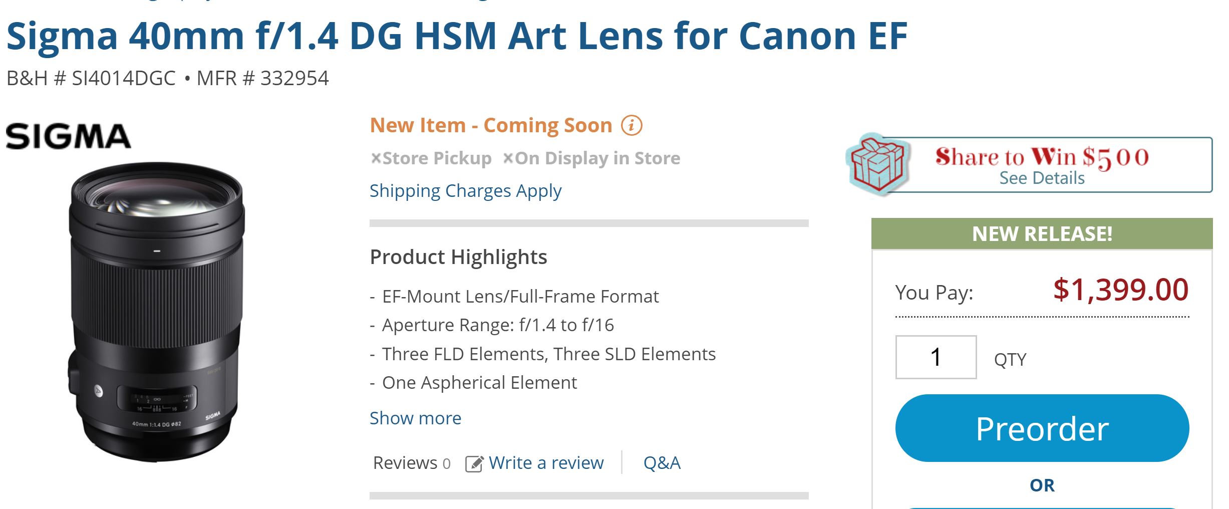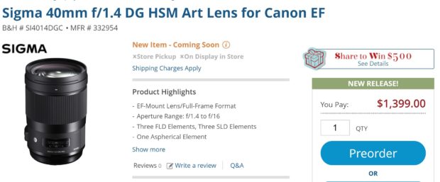 The new Sigma 40mm f/1.4 DG HSM Art Lens and Sigma 56mm f/1.4 DC DN Contemporary Lens now available for pre-order B&H Photo Video and Adorama. The US price for Sigma 40mm f/1.4 DG HSM Art Lens is $1,399, 56mm f/1.4 DC DN Contemporary Lens is $479.