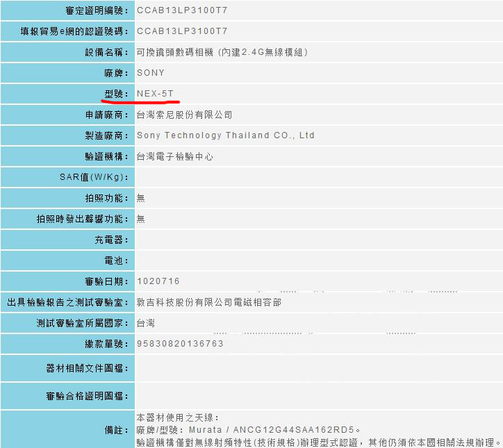 The rumored NEX camera Sony NEX-5T now come to be true. NEX-5T name already registered at Taiwan NCC. It is expected this camera to be announced soon.