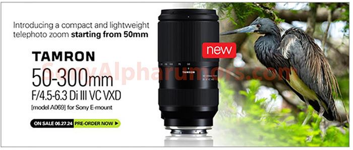This is the first image of the upcoming Tamron 50-300mm F4.5-6.3 Di III VC VXD Lens, leaked at SAR. It is scheduled to be officially announced on June 6th, 2024. The wight will be 665g compared to the 1,2kg of the longer tele lens.