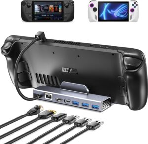 - [Portable & Lightweight] This is A Perfect Combination for the ROG Ally/Steam Deck.iVoler all-in-1 Steam Deck docking station blends Hub and stand together perfectly. You don’t have to buy a regular hub and a stand base for your Steam Deck, which is not only easier for you to use, but also keeps your desktop neat and organized.