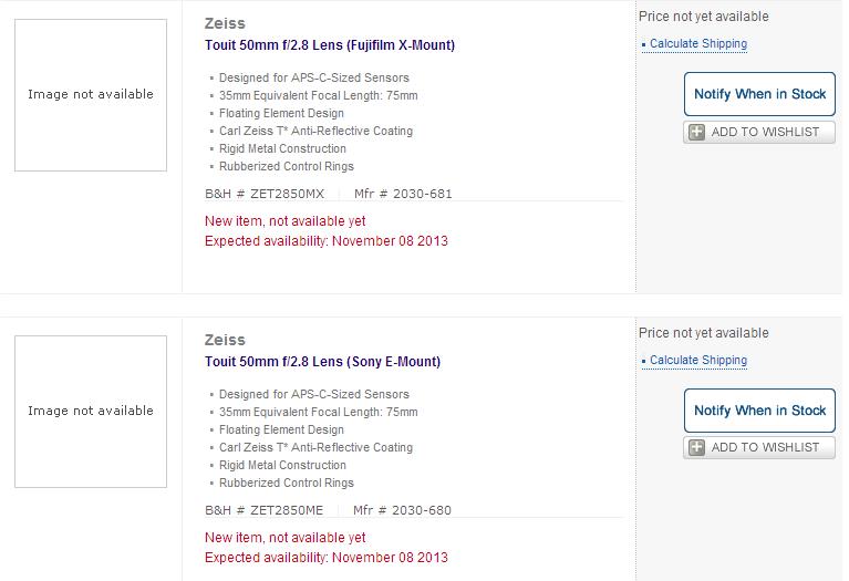 According to B&H Photo Video, the shipping date for Zeiss Touit 50mm f/2.8 Macro lens is on November 08, 2013. This lens will be available for Sony E-mount and Fujifilm X-mount.